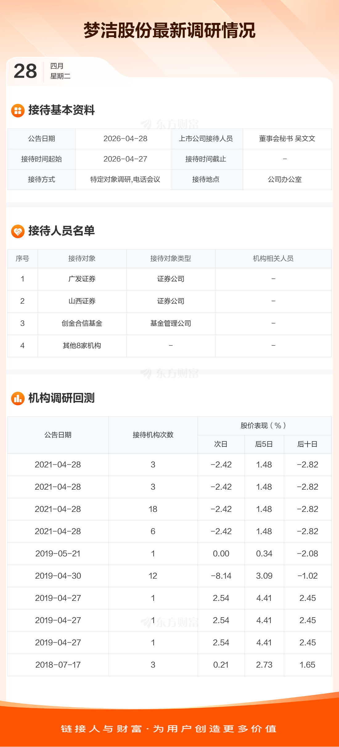 梦洁股份4月28日公告称,4月27日接待广发证券等4家机构调研。接待人员包括董事会秘书 吴文文。