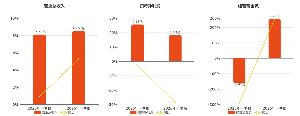 公司营业总收入为45.67亿元,在已披露的同业公司中排名第7,较去年同报告期营业总收入增加2.28亿元,实现3年连续上涨,同比较去年同期上涨5.25%。归母净利润为1.53亿元,在已披露的同业公司中排名第12,较去年同报告期归母净利润减少6175.80万元,同比较去年同期下降28.71%。经营活动现金净流入为2.24亿元,在已披露的同业公司中排名第11,较去年同报告期经营活动现金净流入增加3.69亿元。