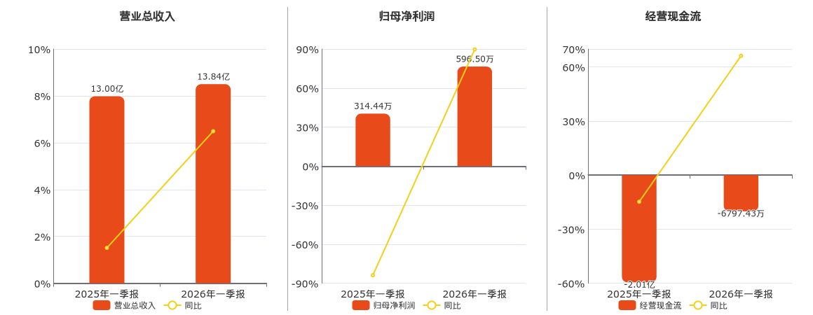 公司营业总收入为13.84亿元。归母净利润为596.50万元。经营活动现金净流入为-6797.43万元。