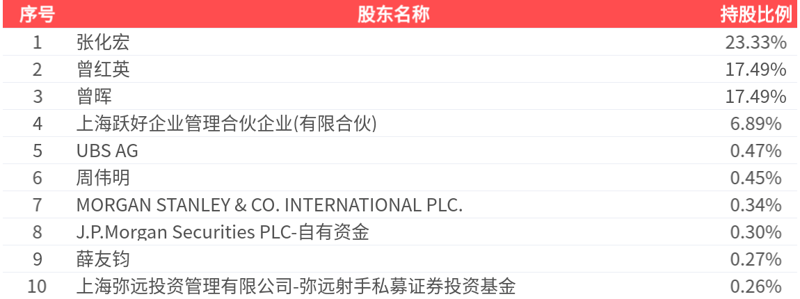 公司股东户数为1.38万户,前十大股东持股数量为6969.48万股,占总股本比例为67.29%,前十大股东持股情况如下: