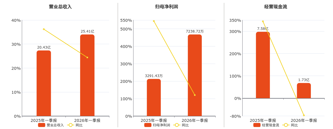 公司营业总收入为25.41亿元,在已披露的同业公司中排名第2,较去年同报告期营业总收入增加4.99亿元,实现3年连续上涨,同比较去年同期上涨24.40%。归母净利润为7238.72万元,在已披露的同业公司中排名第3,较去年同报告期归母净利润增加3947.30万元,实现4年连续上涨,同比较去年同期上涨119.93%。经营活动现金净流入为1.73亿元,在已披露的同业公司中排名第1。