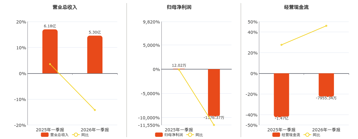 公司营业总收入为5.30亿元,在已披露的同业公司中排名第30,较去年同报告期营业总收入减少8775.84万元,同比较去年同期下降14.21%。归母净利润为-1376.37万元,在已披露的同业公司中排名第106,较去年同报告期归母净利润减少1388.40万元,同比较去年同期下降11547.72%。经营活动现金净流入为-7955.34万元,在已披露的同业公司中排名第91,较去年同报告期经营活动现金净流入增加6768.35万元,实现2年连续上涨。