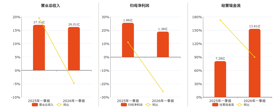 公司营业总收入为26.01亿元,在已披露的同业公司中排名第1,较去年同报告期营业总收入减少1.30亿元,同比较去年同期下降4.76%。归母净利润为1.38亿元,在已披露的同业公司中排名第1,较去年同报告期归母净利润减少4797.48万元,同比较去年同期下降25.75%。经营活动现金净流入为13.81亿元,在已披露的同业公司中排名第1,较去年同报告期经营活动现金净流入增加6.53亿元,实现2年连续上涨,同比较去年同期上涨89.64%。