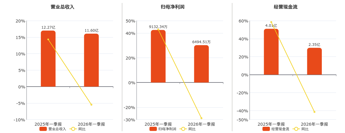 公司营业总收入为11.60亿元,在已披露的同业公司中排名第5,较去年同报告期营业总收入减少6716.46万元,同比较去年同期下降5.48%。归母净利润为6494.51万元,在已披露的同业公司中排名第4,较去年同报告期归母净利润减少2637.83万元,同比较去年同期下降28.88%。经营活动现金净流入为2.35亿元,在已披露的同业公司中排名第3,较去年同报告期经营活动现金净流入减少1.66亿元,同比较去年同期下降41.49%。