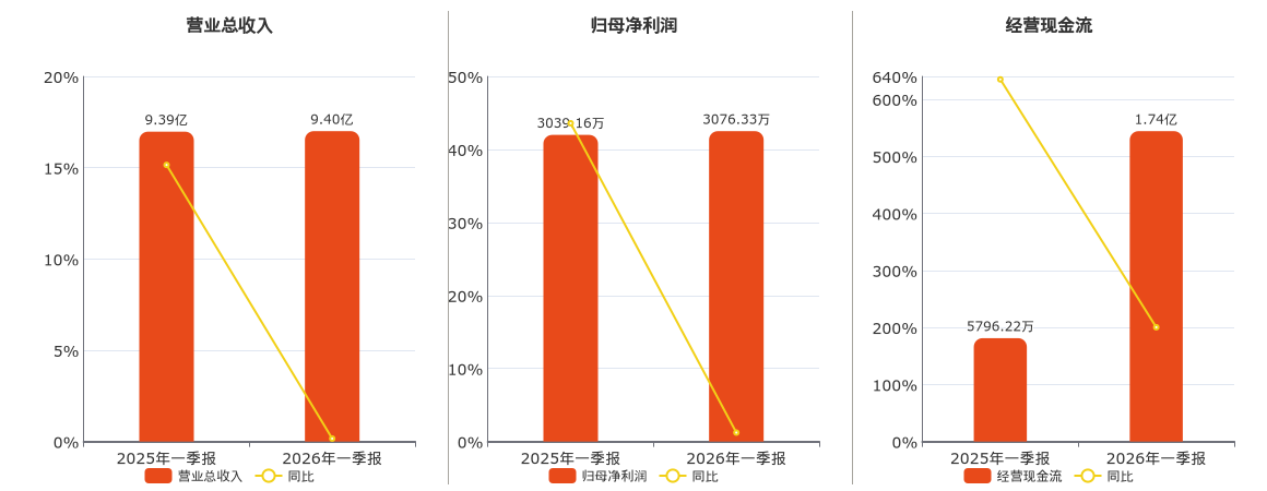 公司营业总收入为9.40亿元。归母净利润为3076.33万元。经营活动现金净流入为1.74亿元。