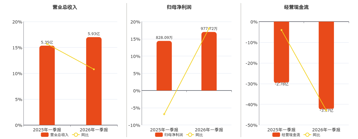 公司营业总收入为5.93亿元,在已披露的同业公司中排名第2。归母净利润为977.72万元,在已披露的同业公司中排名第2。经营活动现金净流入为-3.97亿元,在已披露的同业公司中排名第2,较去年同报告期经营活动现金净流入减少1.19亿元。