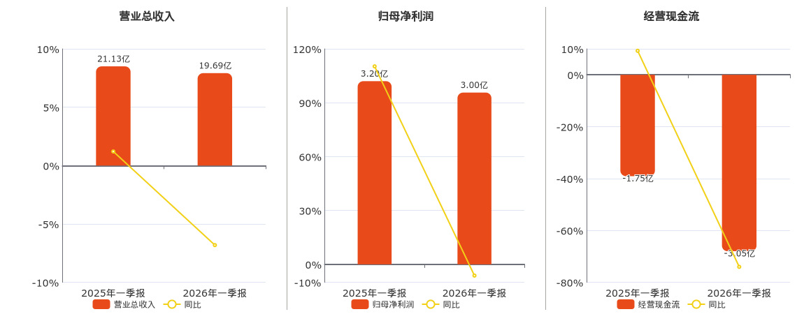 公司营业总收入为19.69亿元,较去年同报告期营业总收入减少1.44亿元,同比较去年同期下降6.81%。归母净利润为3.00亿元,较去年同报告期归母净利润减少1993.59万元,同比较去年同期下降6.23%。经营活动现金净流入为-3.05亿元,较去年同报告期经营活动现金净流入减少1.30亿元。