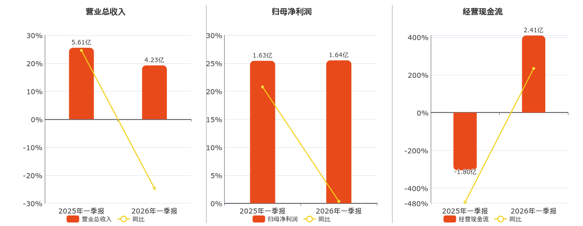 公司营业总收入为4.23亿元,较去年同报告期营业总收入减少1.38亿元,同比较去年同期下降24.68%。归母净利润为1.64亿元。经营活动现金净流入为2.41亿元。