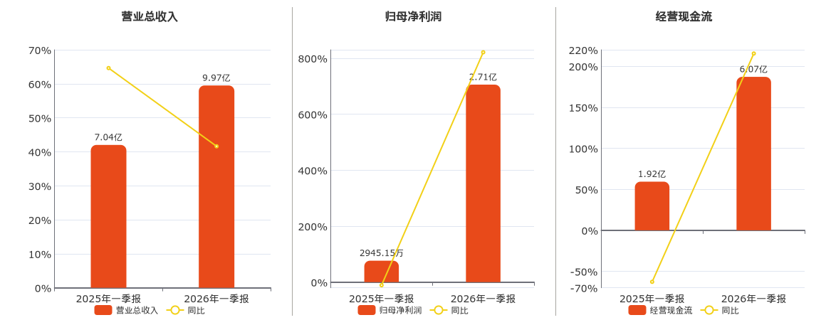 公司营业总收入为9.97亿元。归母净利润为2.71亿元。经营活动现金净流入为6.07亿元。
