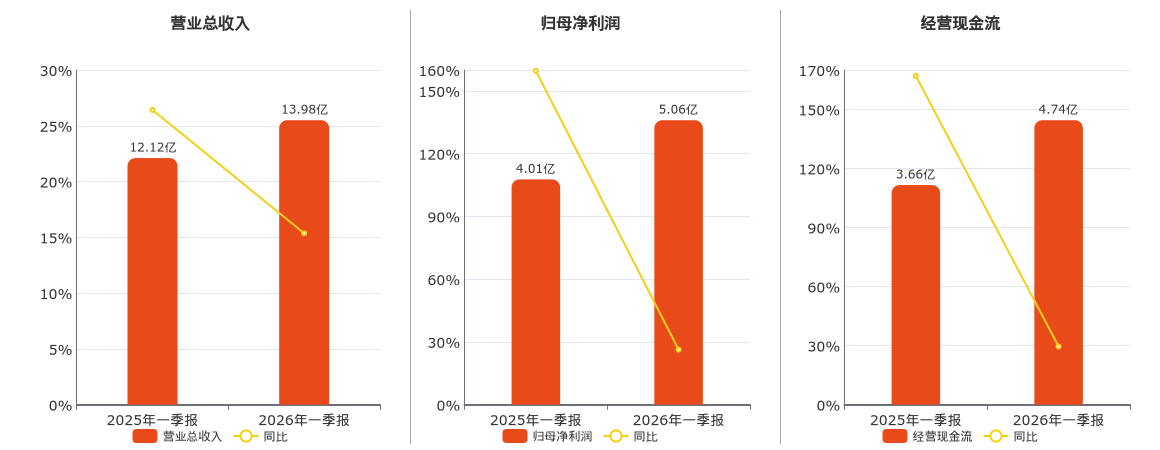 公司营业总收入为13.98亿元。归母净利润为5.06亿元。经营活动现金净流入为4.74亿元。