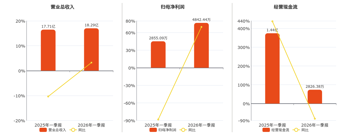 公司营业总收入为18.29亿元。归母净利润为4842.44万元。经营活动现金净流入为2826.38万元,较去年同报告期经营活动现金净流入减少1.15亿元,同比较去年同期下降80.33%。