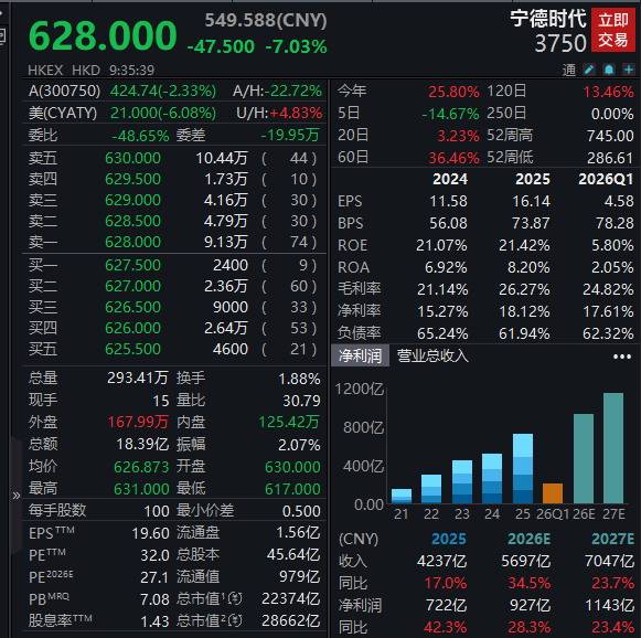 【大河财立方消息】4月28日开盘,宁德时代A股、港股纷纷大跌。截至9时35分发稿,宁德时代A股跌2.29%,港股跌7.03%。