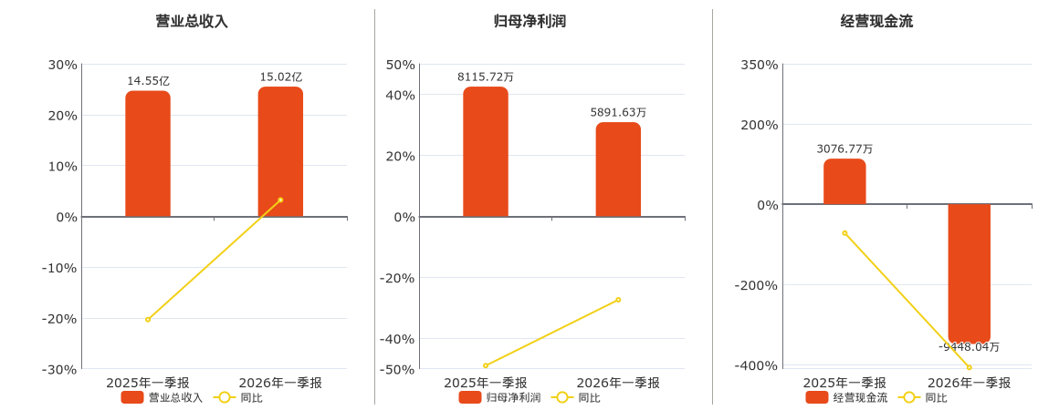 公司营业总收入为15.02亿元,较去年同报告期营业总收入增加4650.66万元,同比较去年同期上涨3.20%。归母净利润为5891.63万元,较去年同报告期归母净利润减少2224.09万元,同比较去年同期下降27.40%。经营活动现金净流入为-9448.04万元,较去年同报告期经营活动现金净流入减少1.25亿元,同比较去年同期下降407.08%。