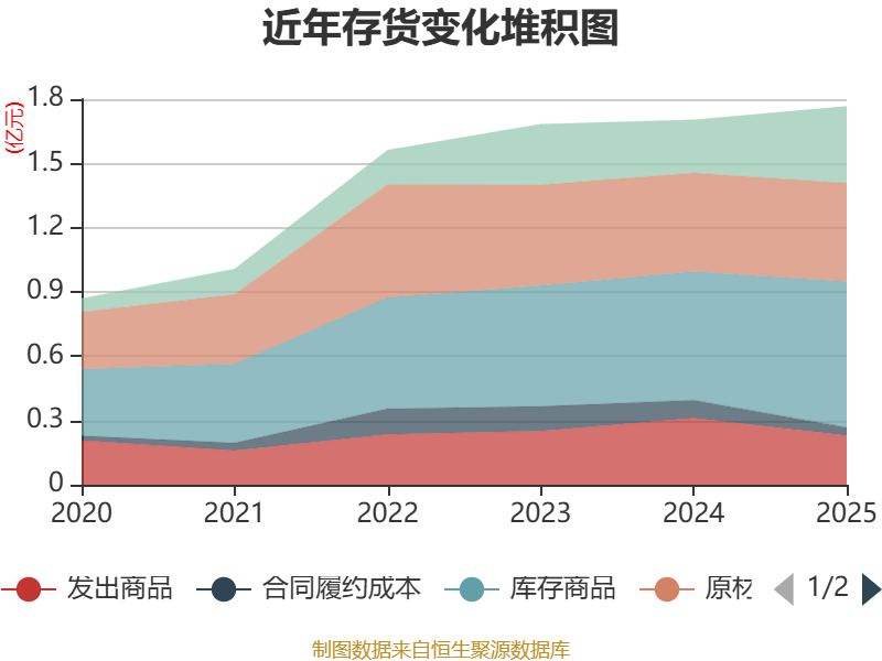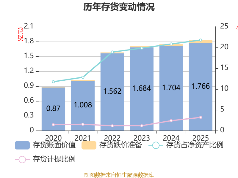 从存货变动来看,截至2025年末,公司存货账面价值为1.77亿元,占净资产的21.79%,较上年末增加615.1万元。其中,存货跌价准备为576.5万元,计提比例为3.16%。