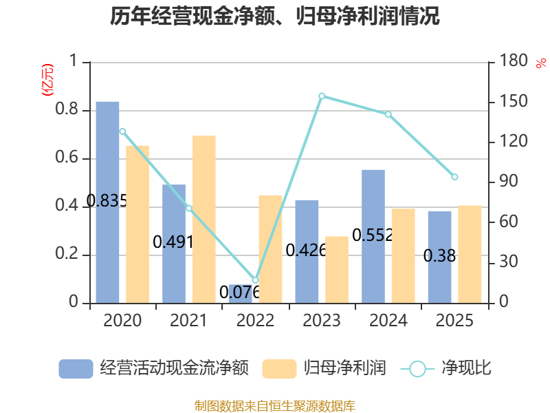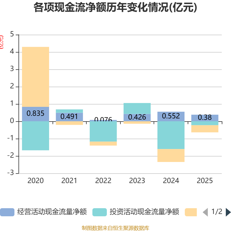 截至2025年,公司经营活动现金流净额为3803.05万元,同比下降31.05%;筹资活动现金流净额-4111.56万元,同比增加3342.66万元;投资活动现金流净额-2279.24万元,上年同期为-1.6亿元。