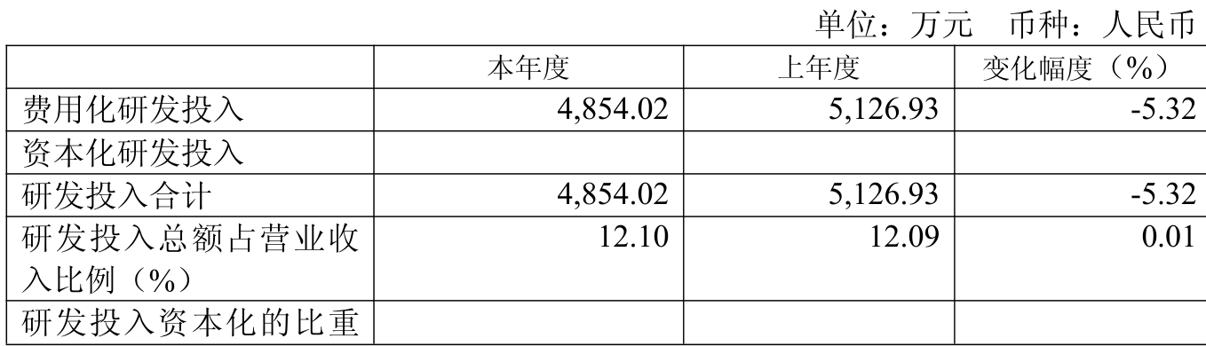 2025年全年,公司研发投入金额为4854.02万元,同比下降5.32%;研发投入占营业收入比例为12.1%,相比上年同期上升0.01个百分点。