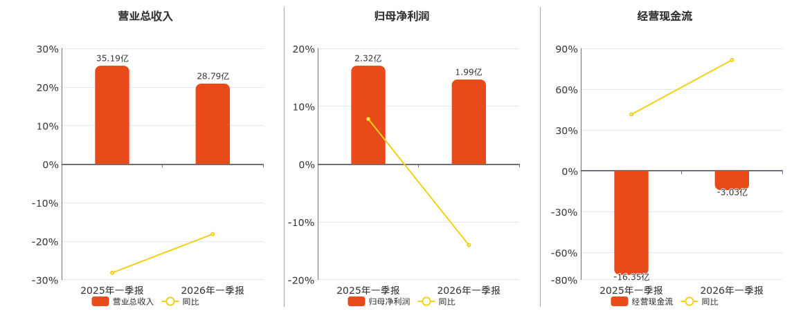 公司营业总收入为28.79亿元,较去年同报告期营业总收入减少6.39亿元,同比较去年同期下降18.17%。归母净利润为1.99亿元,较去年同报告期归母净利润减少3247.56万元,同比较去年同期下降14.02%。经营活动现金净流入为-3.03亿元,较去年同报告期经营活动现金净流入增加13.33亿元,实现2年连续上涨。
