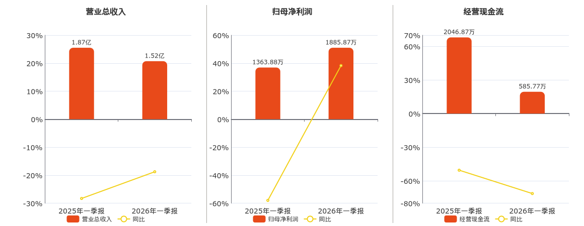 公司营业总收入为1.52亿元。归母净利润为1885.87万元,较去年同报告期归母净利润增加521.99万元,同比较去年同期上涨38.27%。经营活动现金净流入为585.77万元。