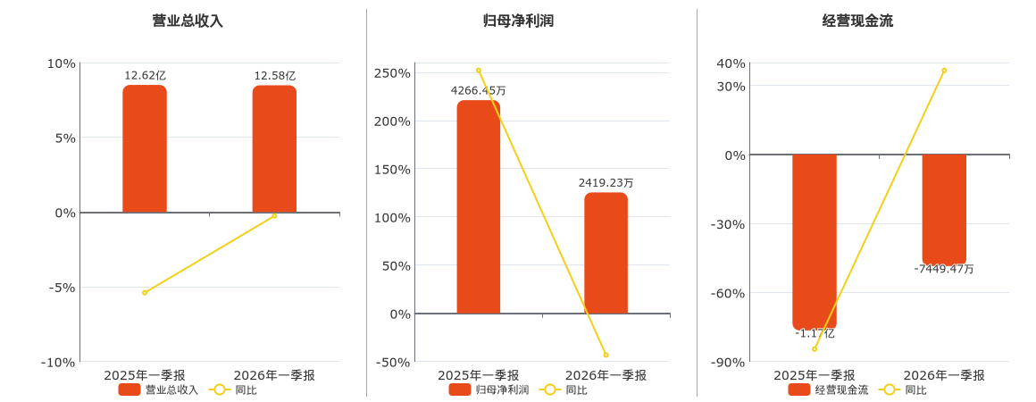 公司营业总收入为12.58亿元,在已披露的同业公司中排名第6,较去年同报告期营业总收入减少325.49万元,同比较去年同期下降0.26%。归母净利润为2419.23万元,在已披露的同业公司中排名第6,较去年同报告期归母净利润减少1847.23万元,同比较去年同期下降43.30%。经营活动现金净流入为-7449.47万元,在已披露的同业公司中排名第8,较去年同报告期经营活动现金净流入增加4293.86万元。