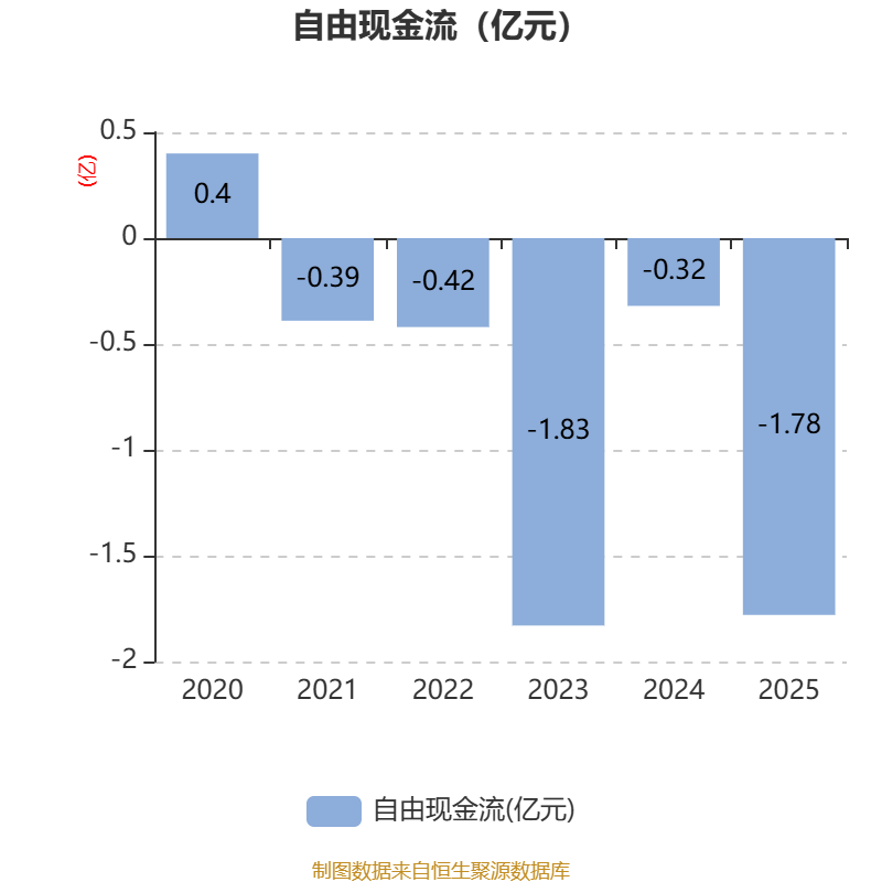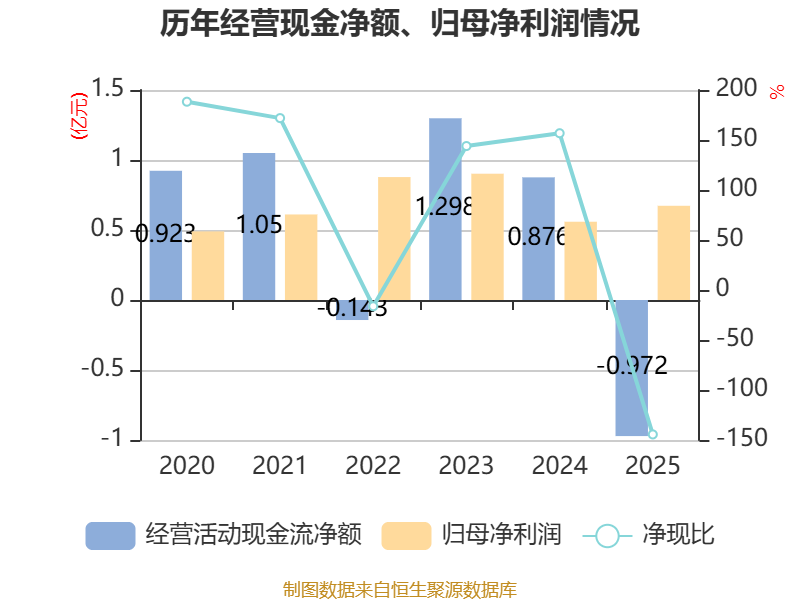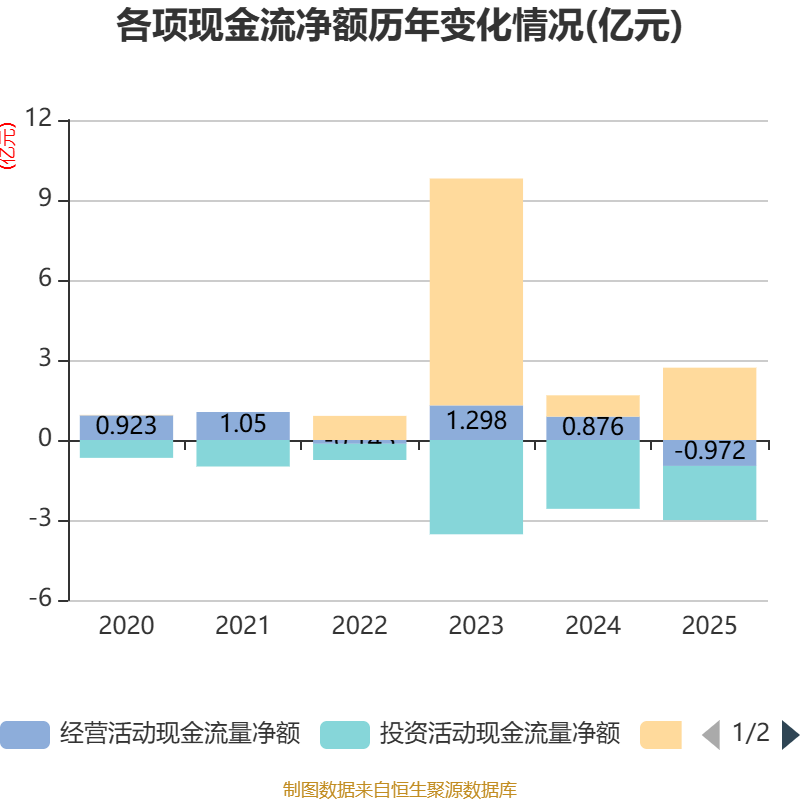 截至2025年,公司经营活动现金流净额为-9722.11万元,同比减少1.85亿元;筹资活动现金流净额2.71亿元,同比增加1.91亿元;投资活动现金流净额-2.03亿元,上年同期为-2.58亿元。