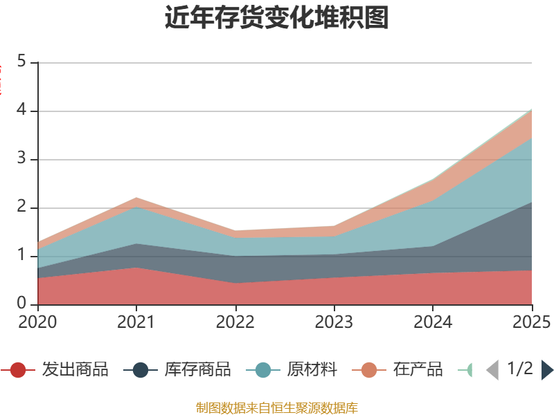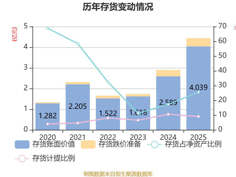 从存货变动来看,截至2025年末,公司存货账面价值为4.04亿元,占净资产的25.53%,较上年末增加1.45亿元。其中,存货跌价准备为4006.3万元,计提比例为9.02%。