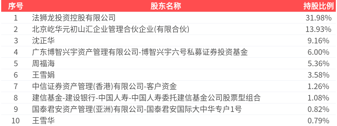 公司股东户数为5900户,前十大股东持股数量为9298.43万股,占总股本比例为73.96%,前十大股东持股情况如下:
