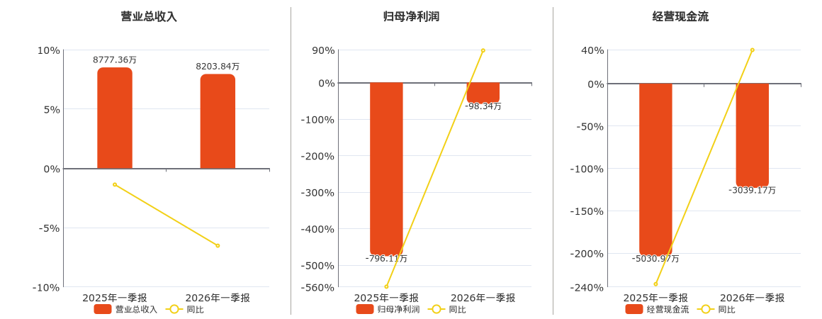 公司营业总收入为8203.84万元,在已披露的同业公司中排名第20,较去年同报告期营业总收入减少573.52万元,同比较去年同期下降6.53%。归母净利润为-98.34万元,在已披露的同业公司中排名第18。经营活动现金净流入为-3039.17万元,在已披露的同业公司中排名第16。
