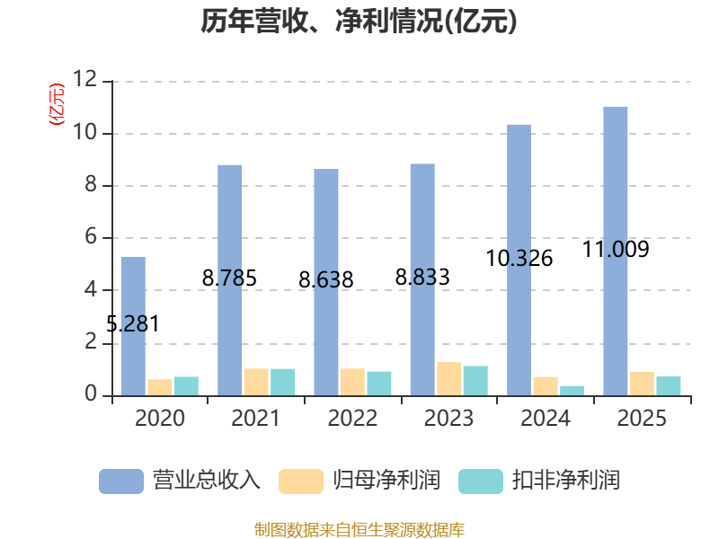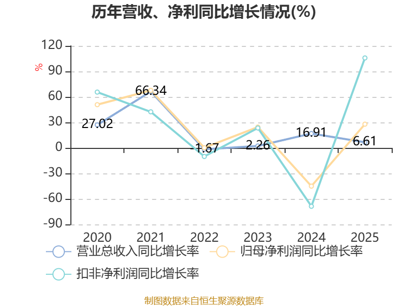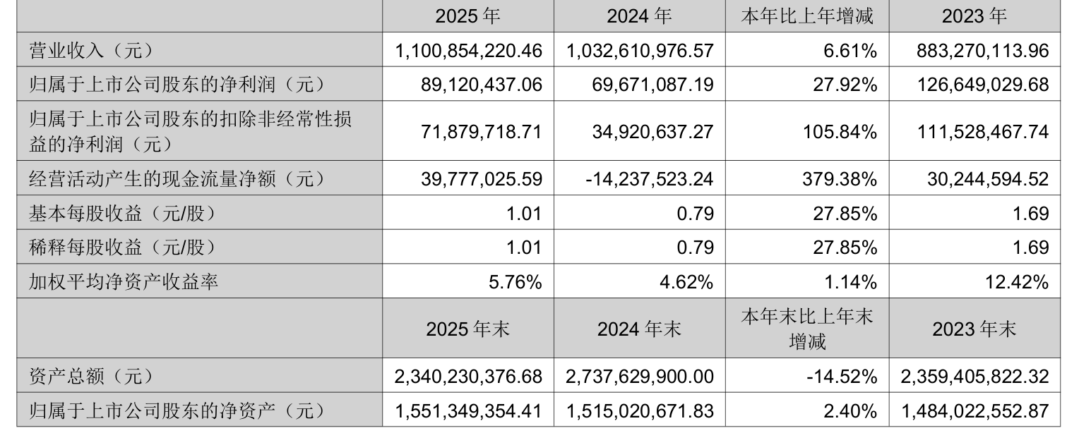 中证智能财讯恒工精密(301261)4月28日披露2025年年度报告。2025年,公司实现营业总收入11.01亿元,同比增长6.61%;归母净利润8912.04万元,同比增长27.92%;扣非净利润7187.97万元,同比增长105.84%;经营活动产生的现金流量净额为3977.7万元,上年同期为-1423.75万元;报告期内,恒工精密基本每股收益为1.01元,加权平均净资产收益率为5.76%。公司2025年度分配预案为:拟向全体股东每10股转2股,派现2.5元(含税)。