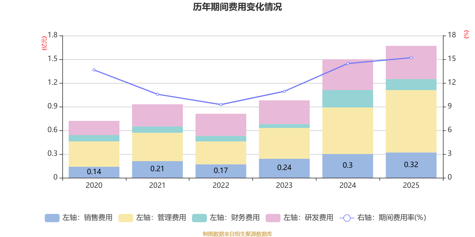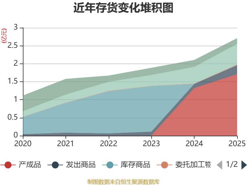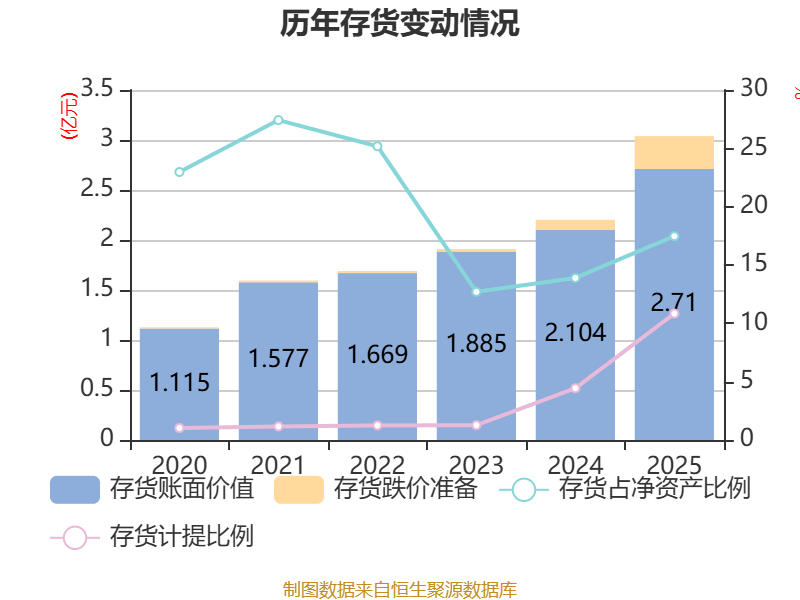 从存货变动来看,截至2025年末,公司存货账面价值为2.71亿元,占净资产的17.47%,较上年末增加6051.27万元。其中,存货跌价准备为3292.67万元,计提比例为10.84%。