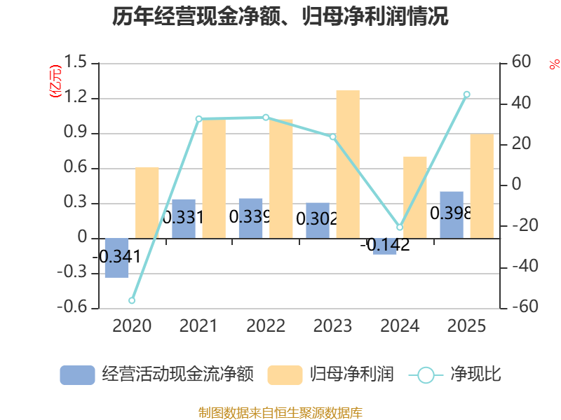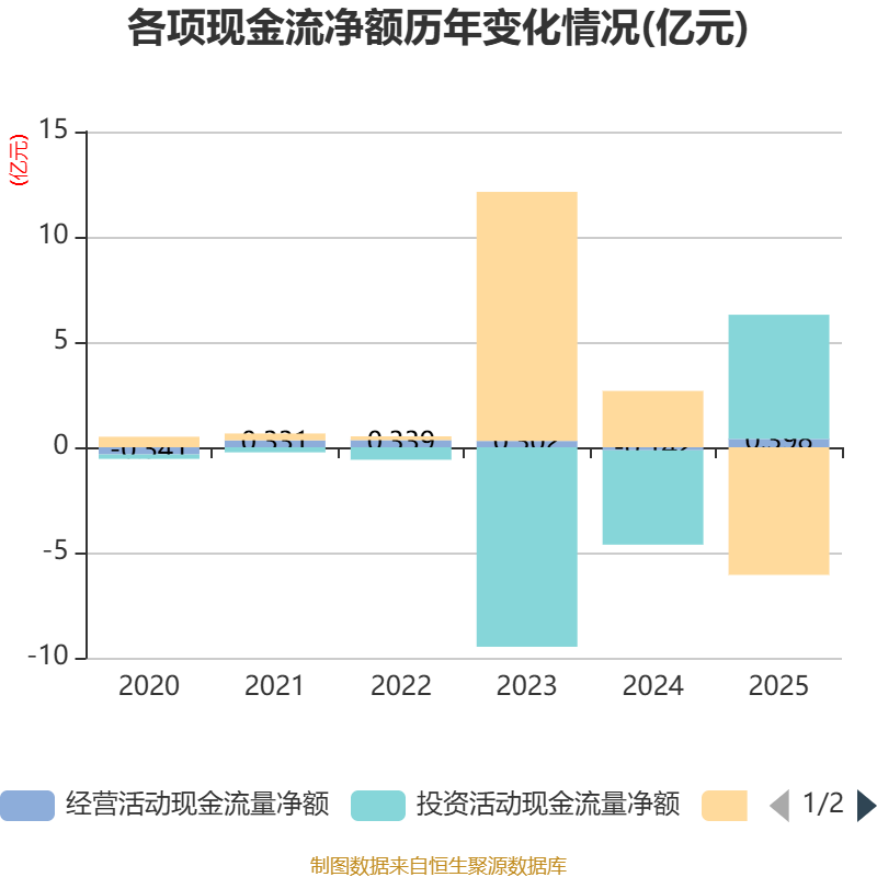 截至2025年,公司经营活动现金流净额为3977.7万元,同比增加5401.45万元;筹资活动现金流净额-6.06亿元,同比减少8.74亿元;投资活动现金流净额5.9亿元,上年同期为-4.48亿元。