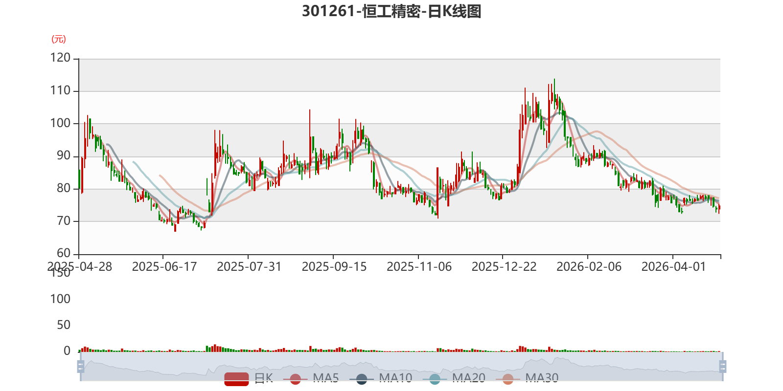 以4月27日收盘价计算,恒工精密目前市盈率(TTM)约为73.77倍,市净率(LF)约4.24倍,市销率(TTM)约5.97倍。