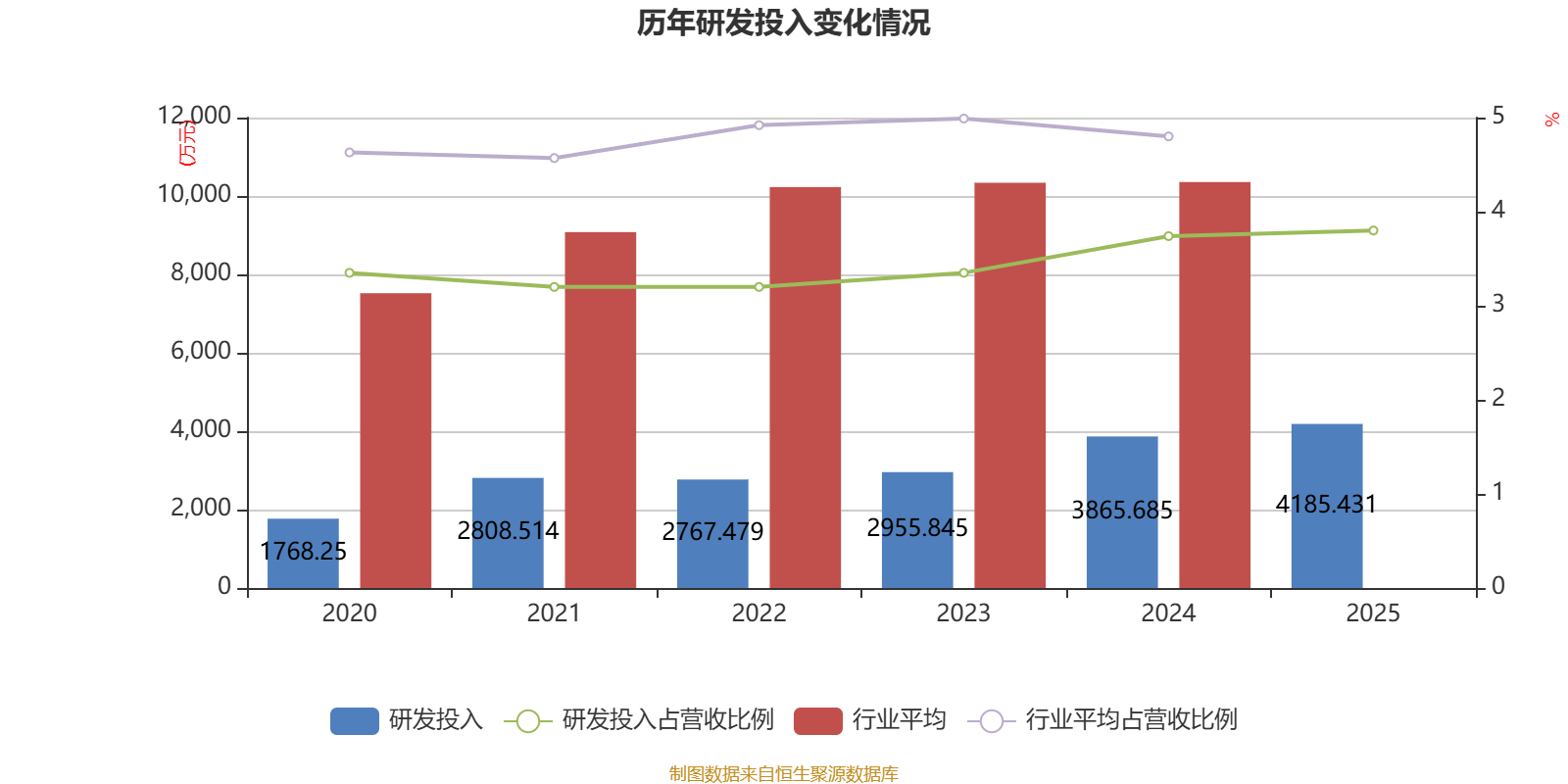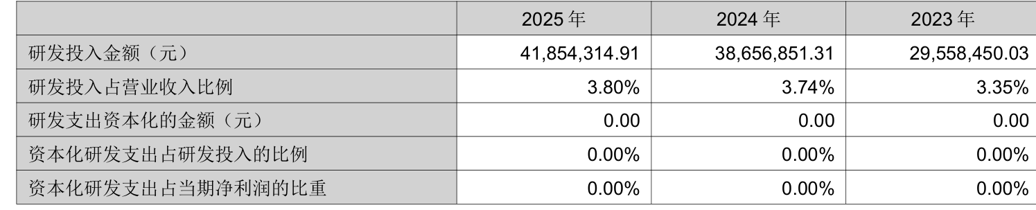 2025年全年,公司研发投入金额为4185.43万元,同比增长8.27%;研发投入占营业收入比例为3.8%,相比上年同期上升0.06个百分点。此外,公司全年研发投入资本化率为0%。