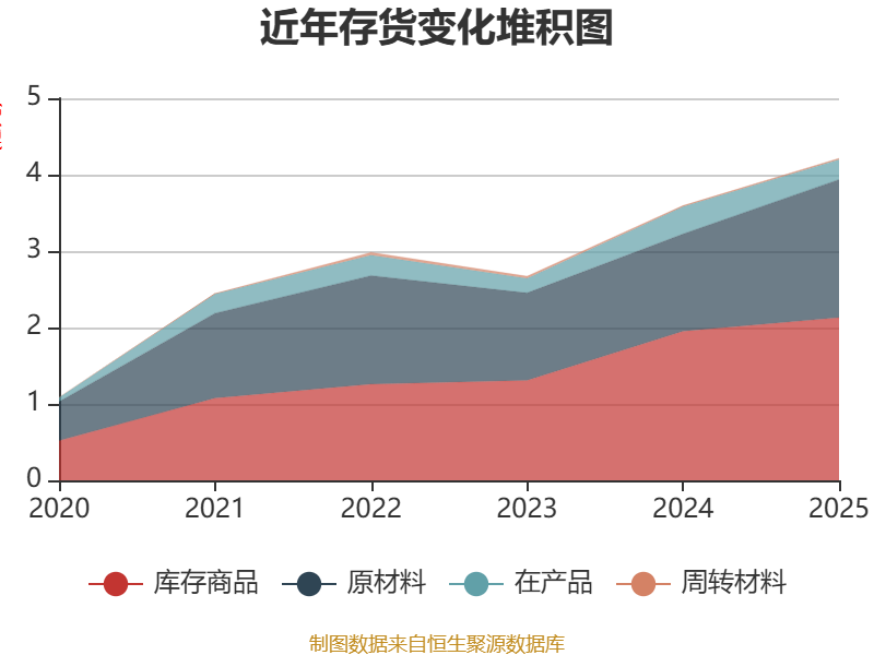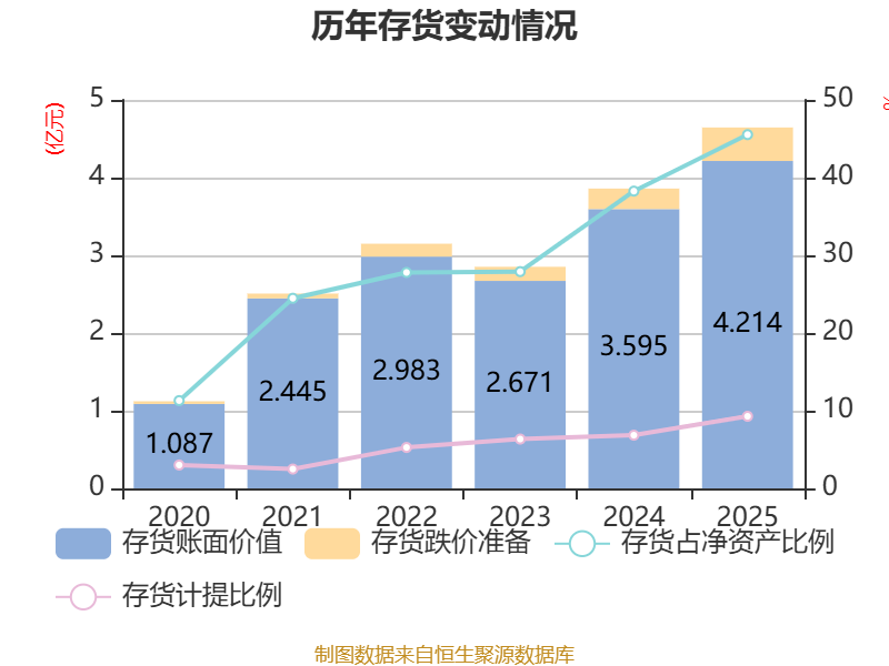 从存货变动来看,截至2025年末,公司存货账面价值为4.21亿元,占净资产的45.53%,较上年末增加6193.5万元。其中,存货跌价准备为4310.11万元,计提比例为9.28%。
