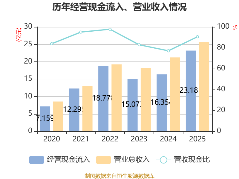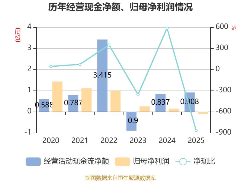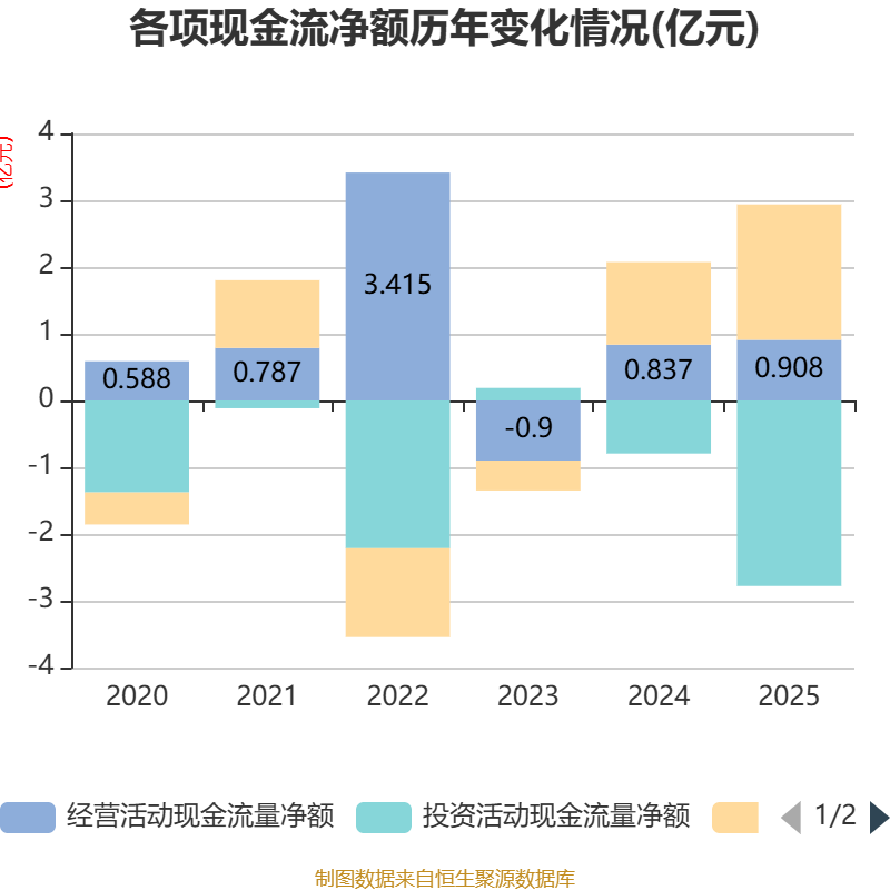 截至2025年,公司经营活动现金流净额为9076.7万元,同比增长8.4%;筹资活动现金流净额2.03亿元,同比增加7926.75万元;投资活动现金流净额-2.78亿元,上年同期为-7945.99万元。