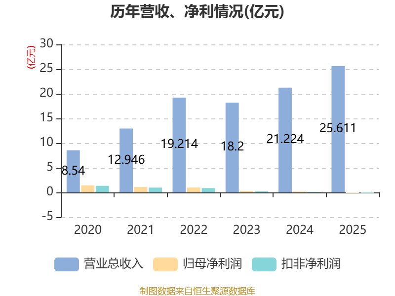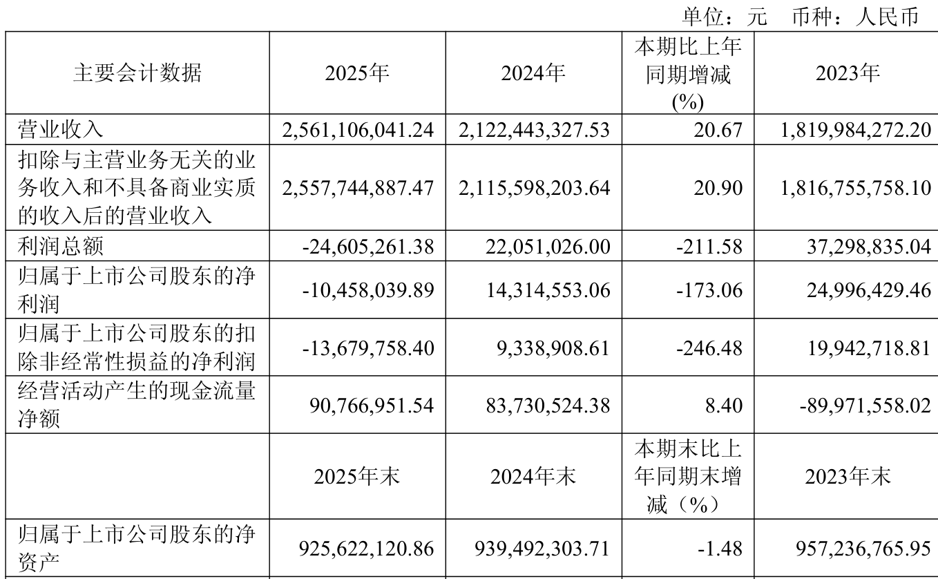 中证智能财讯春光科技(603657)4月28日披露2025年年度报告。2025年,公司实现营业总收入25.61亿元,同比增长20.67%;归母净利润亏损1045.8万元,上年同期盈利1431.46万元;扣非净利润亏损1367.98万元,上年同期盈利933.89万元;经营活动产生的现金流量净额为9076.7万元,同比增长8.40%;报告期内,春光科技基本每股收益为-0.08元,加权平均净资产收益率为-1.12%。