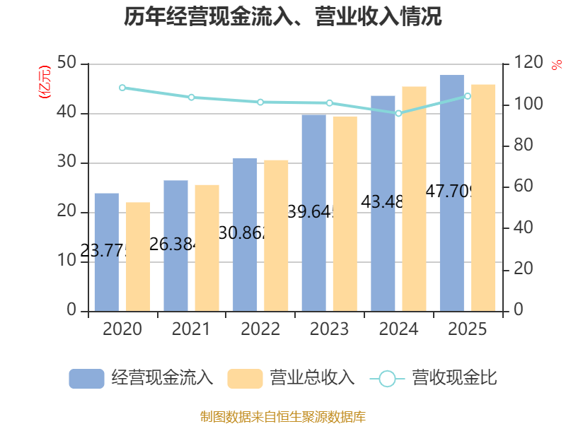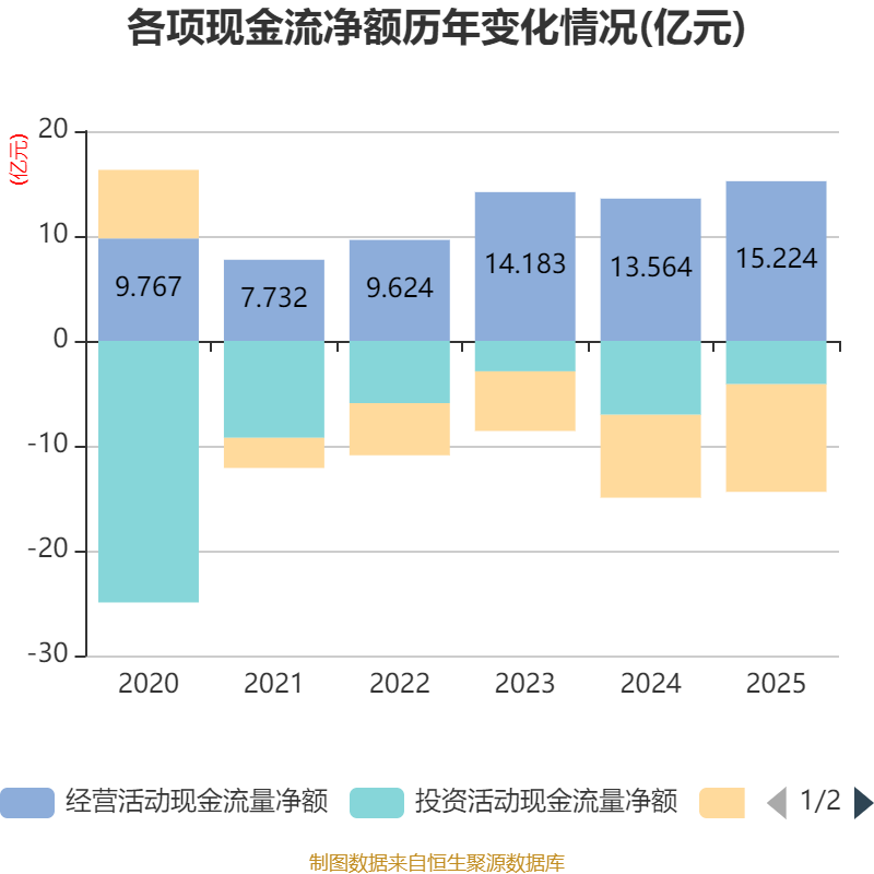 截至2025年,公司经营活动现金流净额为15.22亿元,同比增长12.23%;筹资活动现金流净额-10.26亿元,同比减少2.36亿元;投资活动现金流净额-4.13亿元,上年同期为-7.05亿元。