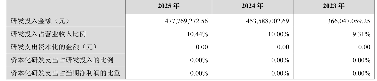 2025年全年,公司研发投入金额为4.78亿元,同比增长5.33%;研发投入占营业收入比例为10.44%,相比上年同期上升0.44个百分点。此外,公司全年研发投入资本化率为0%。