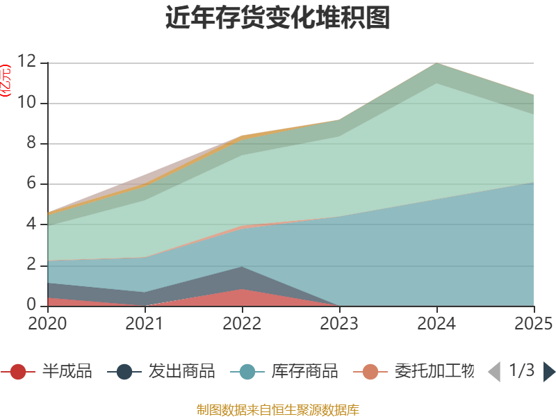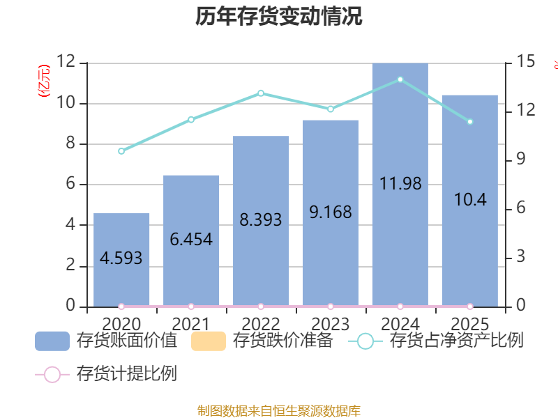 从存货变动来看,截至2025年末,公司存货账面价值为10.4亿元,占净资产的11.37%,较上年末减少1.58亿元。公司本期没有计提存货跌价准备。