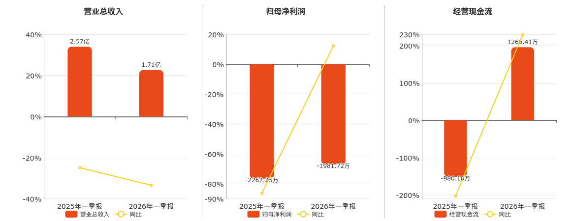 公司营业总收入为1.71亿元,在已披露的同业公司中排名第108,较去年同报告期营业总收入减少8580.02万元,同比较去年同期下降33.43%。归母净利润为-1981.72万元,在已披露的同业公司中排名第134。经营活动现金净流入为1266.41万元,在已披露的同业公司中排名第75。