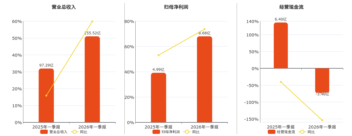 公司营业总收入为155.52亿元,较去年同报告期营业总收入增加58.23亿元,实现2年连续上涨,同比较去年同期上涨59.86%。归母净利润为8.68亿元,较去年同报告期归母净利润增加3.68亿元,实现3年连续上涨,同比较去年同期上涨73.71%。经营活动现金净流入为-3.46亿元。