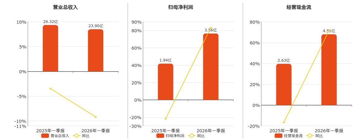 公司营业总收入为23.90亿元,在已披露的同业公司中排名第9。归母净利润为3.56亿元,在已披露的同业公司中排名第9,较去年同报告期归母净利润增加1.61亿元,同比较去年同期上涨83.13%。经营活动现金净流入为4.51亿元,在已披露的同业公司中排名第5,较去年同报告期经营活动现金净流入增加1.88亿元,同比较去年同期上涨71.61%。
