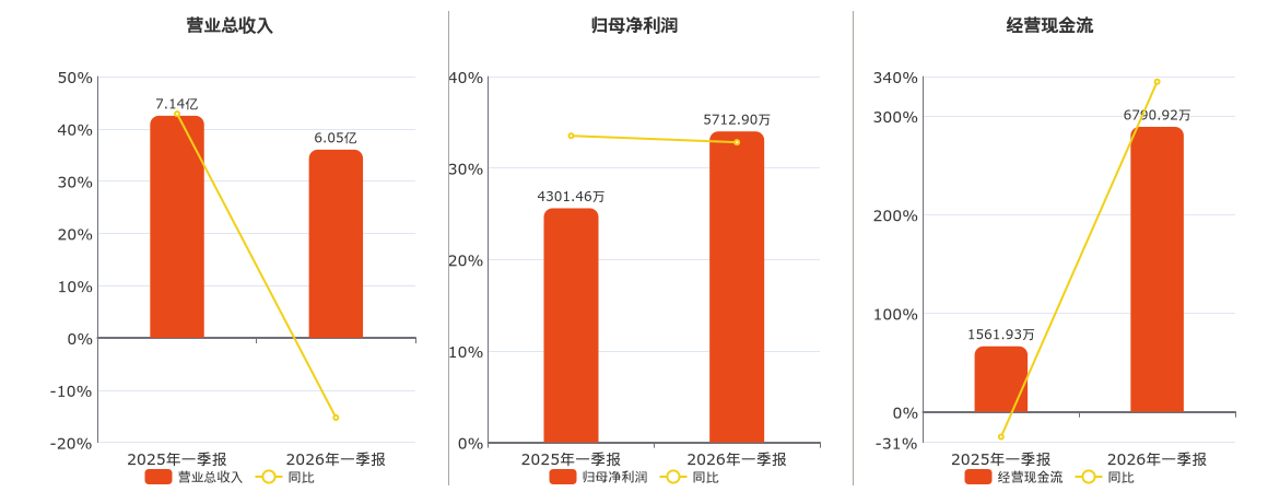 公司营业总收入为6.05亿元,较去年同报告期营业总收入减少1.09亿元,同比较去年同期下降15.26%。归母净利润为5712.90万元。经营活动现金净流入为6790.92万元。