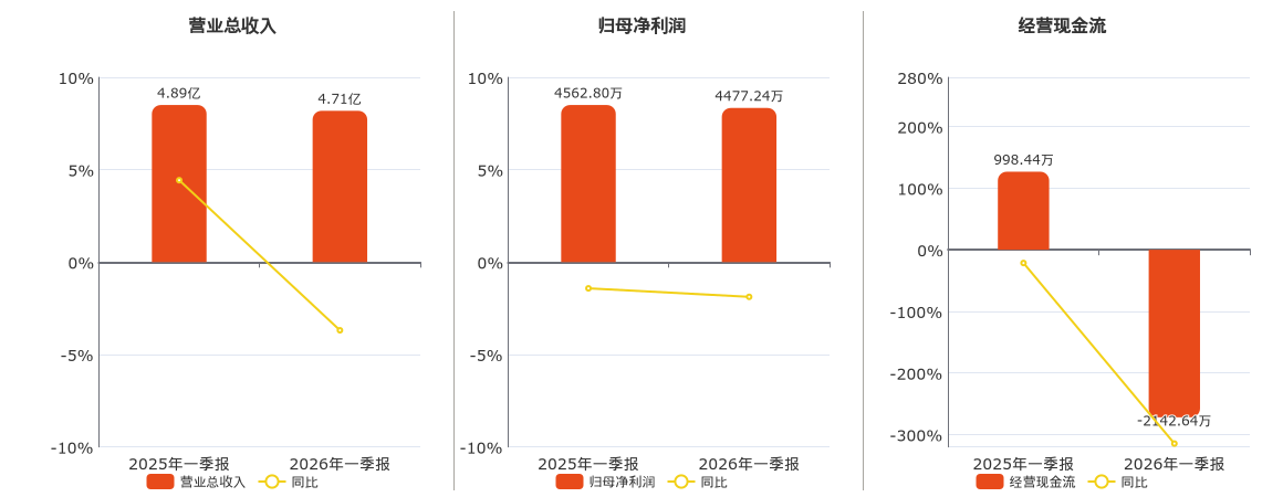公司营业总收入为4.71亿元,在已披露的同业公司中排名第64,较去年同报告期营业总收入减少1805.08万元,同比较去年同期下降3.69%。归母净利润为4477.24万元,在已披露的同业公司中排名第46,较去年同报告期归母净利润减少85.57万元,同比较去年同期下降1.88%。经营活动现金净流入为-2142.64万元,在已披露的同业公司中排名第104,较去年同报告期经营活动现金净流入减少3141.09万元,同比较去年同期下降314.60%。