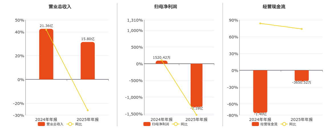 公司营业总收入为15.80亿元,较去年同报告期营业总收入减少5.55亿元,同比较去年同期下降26.00%。归母净利润为-2.18亿元,在已披露的同业公司中排名第16,较去年同报告期归母净利润减少2.34亿元,同比较去年同期下降1535.78%。经营活动现金净流入为-3650.52万元,在已披露的同业公司中排名第17。