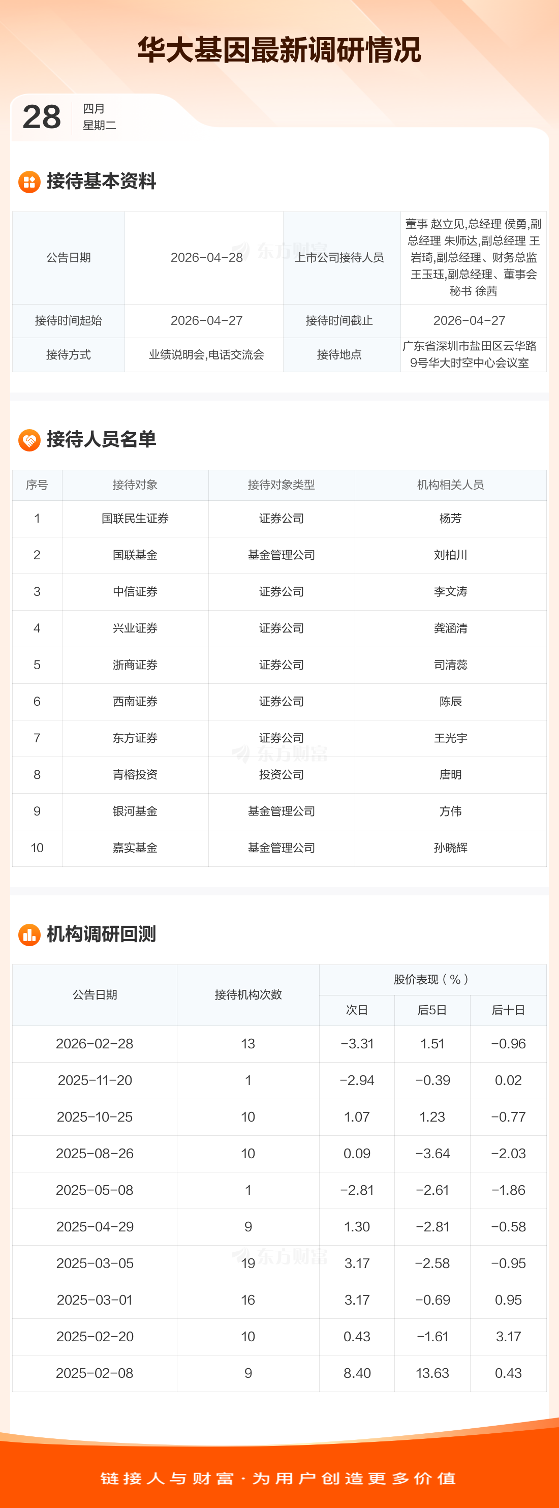 华大基因4月28日公告称,4月27日接待国联民生证券等10家机构调研。接待人员包括董事 赵立见,总经理 侯勇,副总经理 朱师达,副总经理 王岩琦,副总经理、财务总监 王玉珏,副总经理、董事会秘书 徐茜。