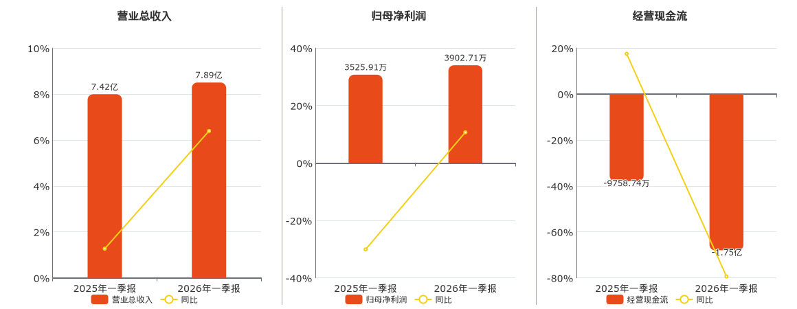 公司营业总收入为7.89亿元。归母净利润为3902.71万元。经营活动现金净流入为-1.75亿元,在已披露的同业公司中排名第64,较去年同报告期经营活动现金净流入减少7747.34万元。