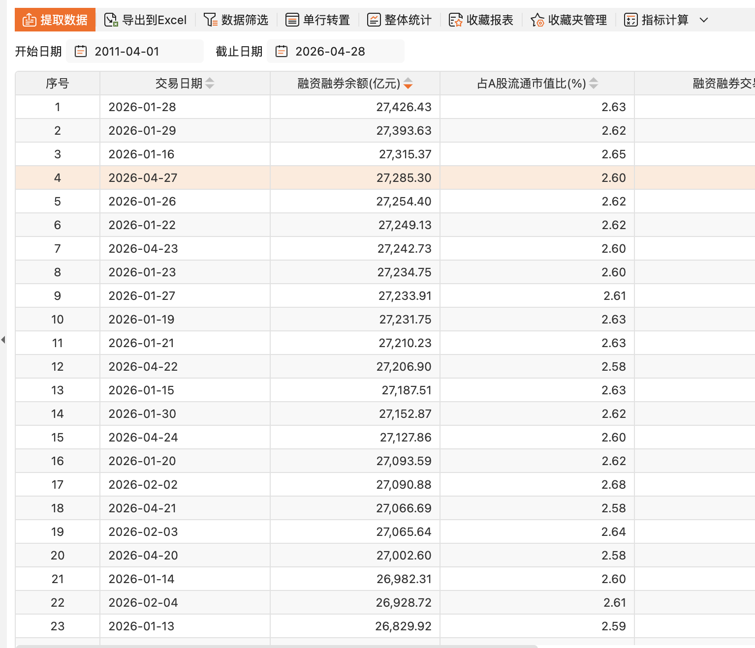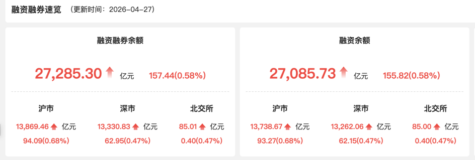 历史第四高 27日两融余额达27285亿元