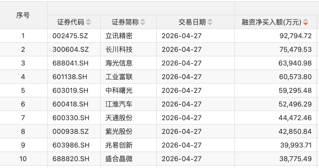 个股方面,55只个股获融资净买入额超1亿元。立讯精密获融资净买入额居首,净买入9.28亿元;融资净买入金额居前的还有长川科技、海光信息、工业富联、中科曙光、江淮汽车、天通股份、紫光股份、兆易创新、盛合晶微等。
