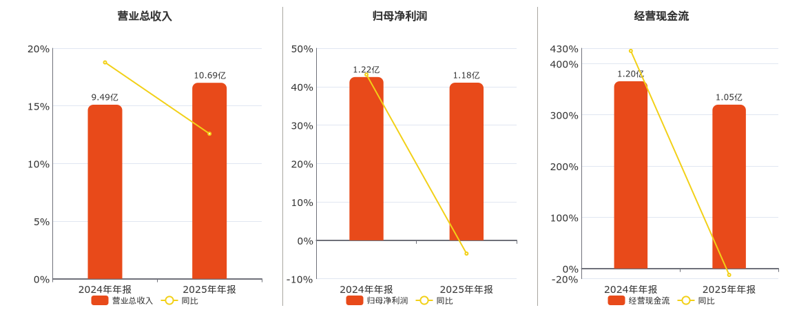 公司营业总收入为10.69亿元,在已披露的同业公司中排名第23。归母净利润为1.18亿元,在已披露的同业公司中排名第17,较去年同报告期归母净利润减少422.04万元,同比较去年同期下降3.45%。经营活动现金净流入为1.05亿元,在已披露的同业公司中排名第18,较去年同报告期经营活动现金净流入减少1498.86万元,同比较去年同期下降12.50%。