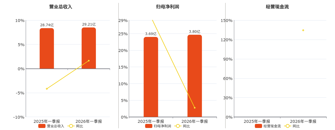 公司营业总收入为29.21亿元,较去年同报告期营业总收入增加3178.03万元,同比较去年同期上涨1.10%。归母净利润为3.80亿元,较去年同报告期归母净利润增加1153.69万元,实现2年连续上涨,同比较去年同期上涨3.13%。经营活动现金净流入为2.66亿元,较去年同报告期经营活动现金净流入增加10.58亿元。